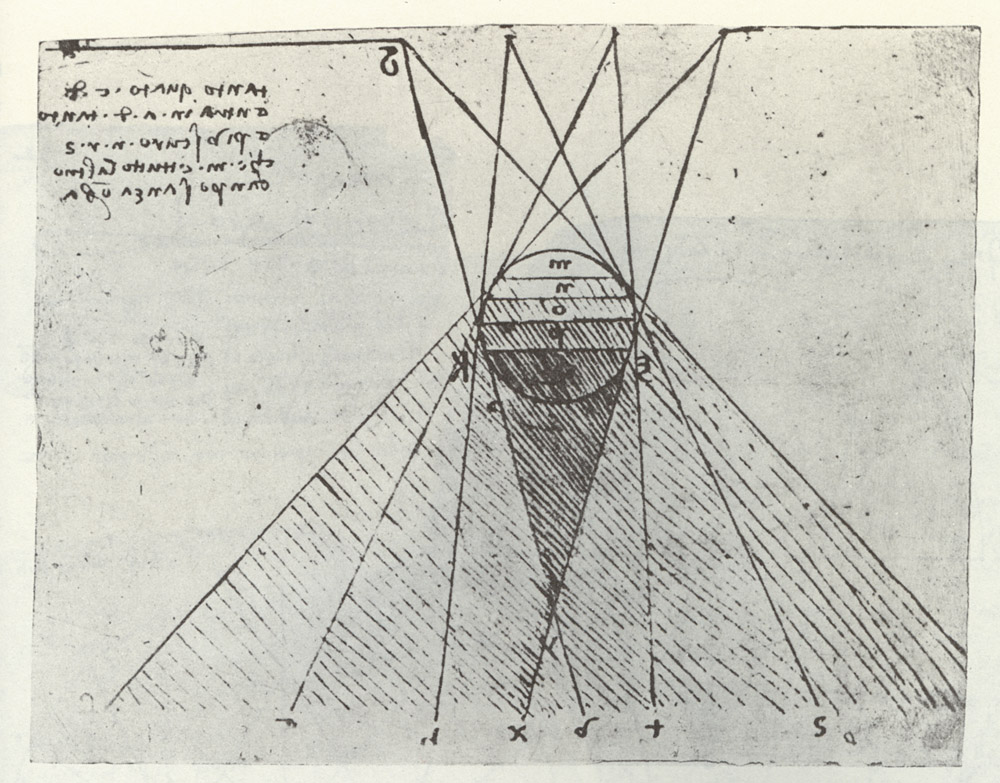Doğanın bir parçası olan gölge ve ışık resimde birbirinden farklı boyutlar ve derinlikler katmamıza yardımcı olur. Gölge ve ışık ile çevrelenmiş nesne çizime aktarılırken ışığın açısı ve yoğunluğu çok önemlidir. Notlar arasında farklı ışık koşullarında gölgenin nasıl olması gerektiğine dair bilgiler mevcuttur. Leonardo da Vinci’ye göre ise hafif ışık en uygunudur çünkü resme zarafet katan bir incelikte olduğunu yazmıştır. Yine bu bölümde de anatomideki gibi göz-nesne-ışık arası mesafeleri harflendirip formüle etmiştir. Çizimleri arasında ışığın gözün arkasına nasıl düştüğü bile betimlenmiştir.